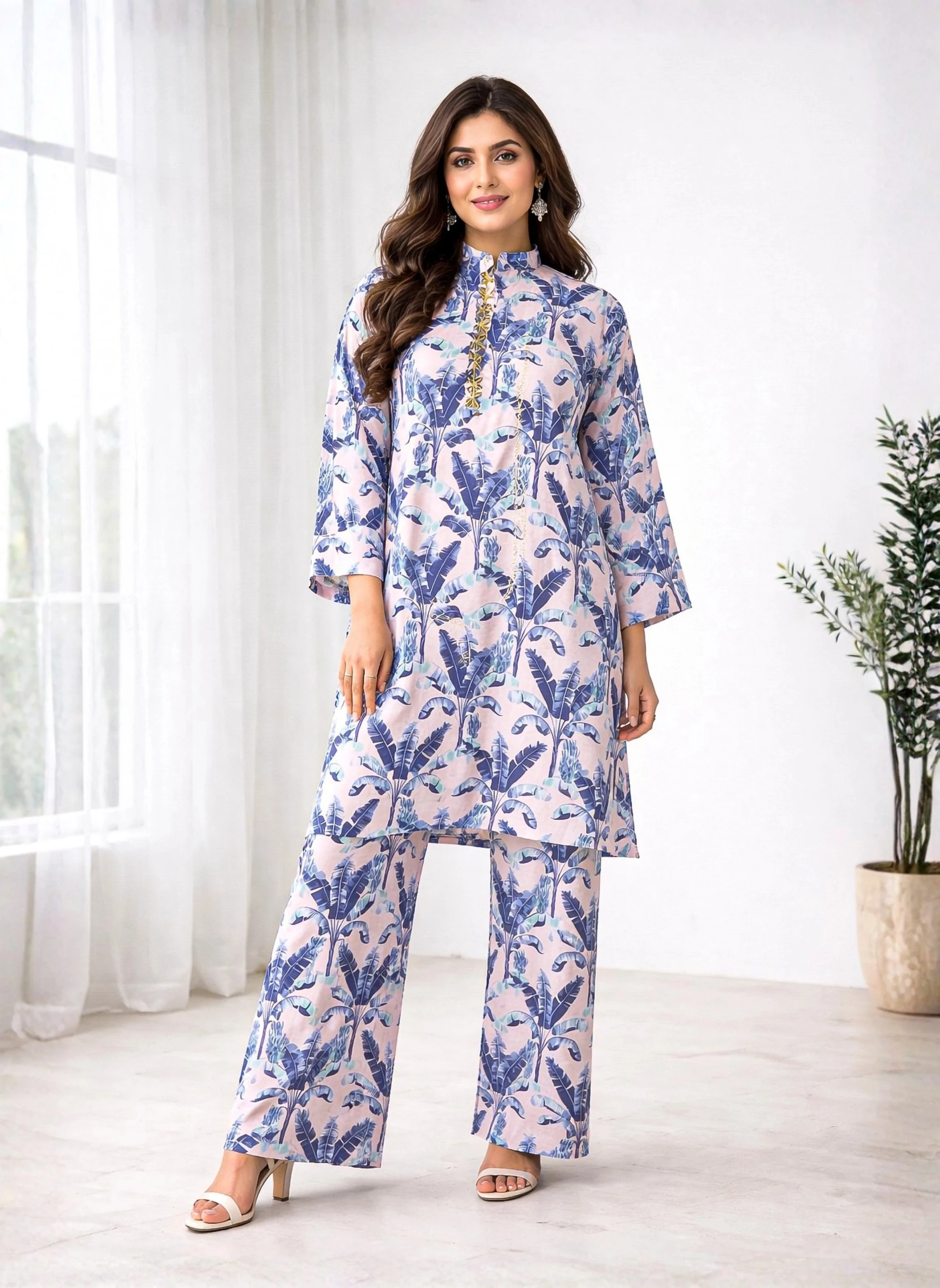 - Design Details: premium Korean Silk 2-piece set. Featuring a vibrant tropical leaf print in shades of blue and lavender on a soft pastel base. The shirt is adorned with a delicate lace-trimmed neckline and paired with matching wide-leg trousers for a chic, contemporary look.