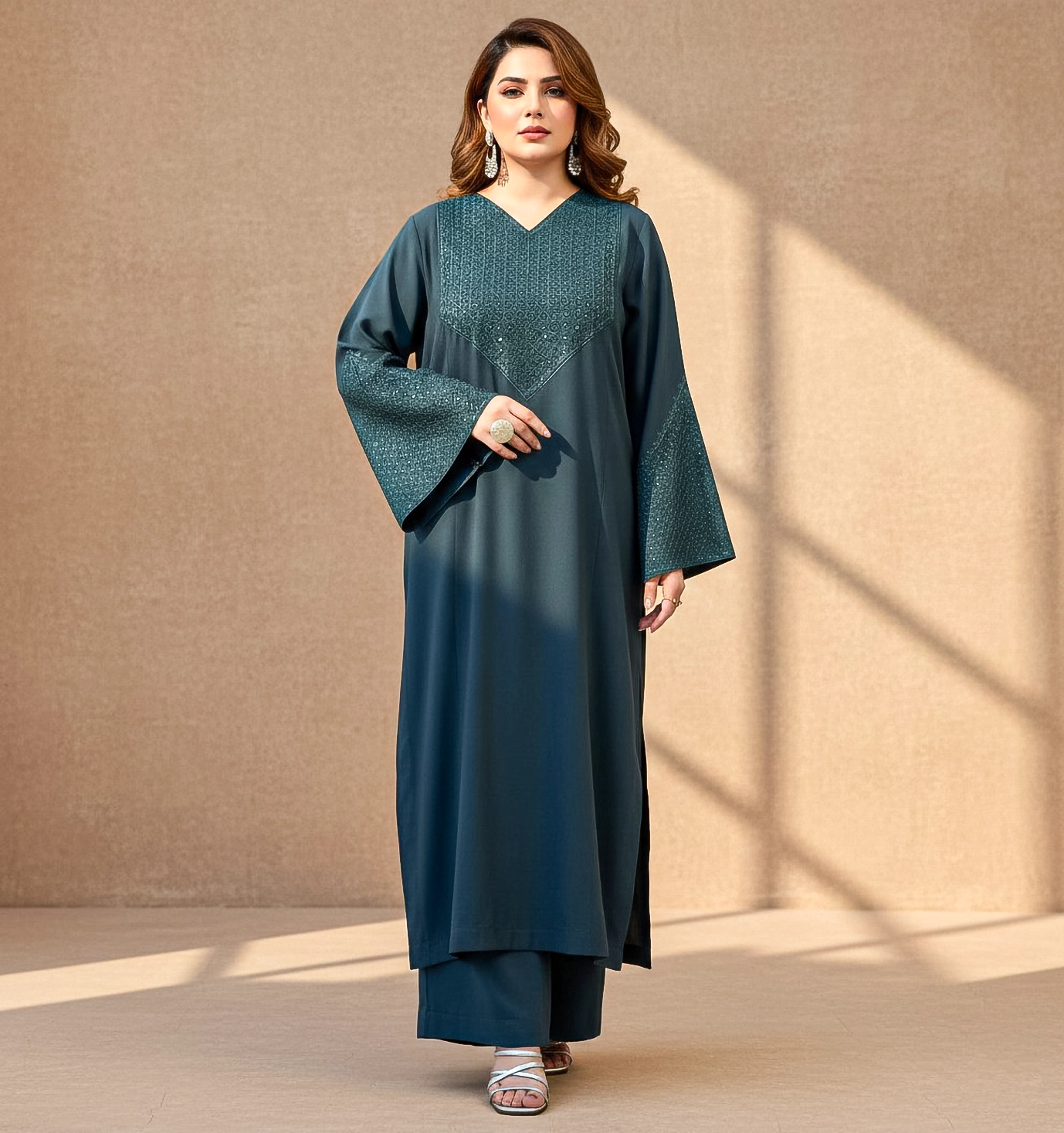 - Design Details: Linen 2-piece outfit. Featuring a sophisticated tonal embroidery on the neckline and wide bell sleeves. Its minimalist design and rich fabric make it perfect for winter gatherings and office wear.