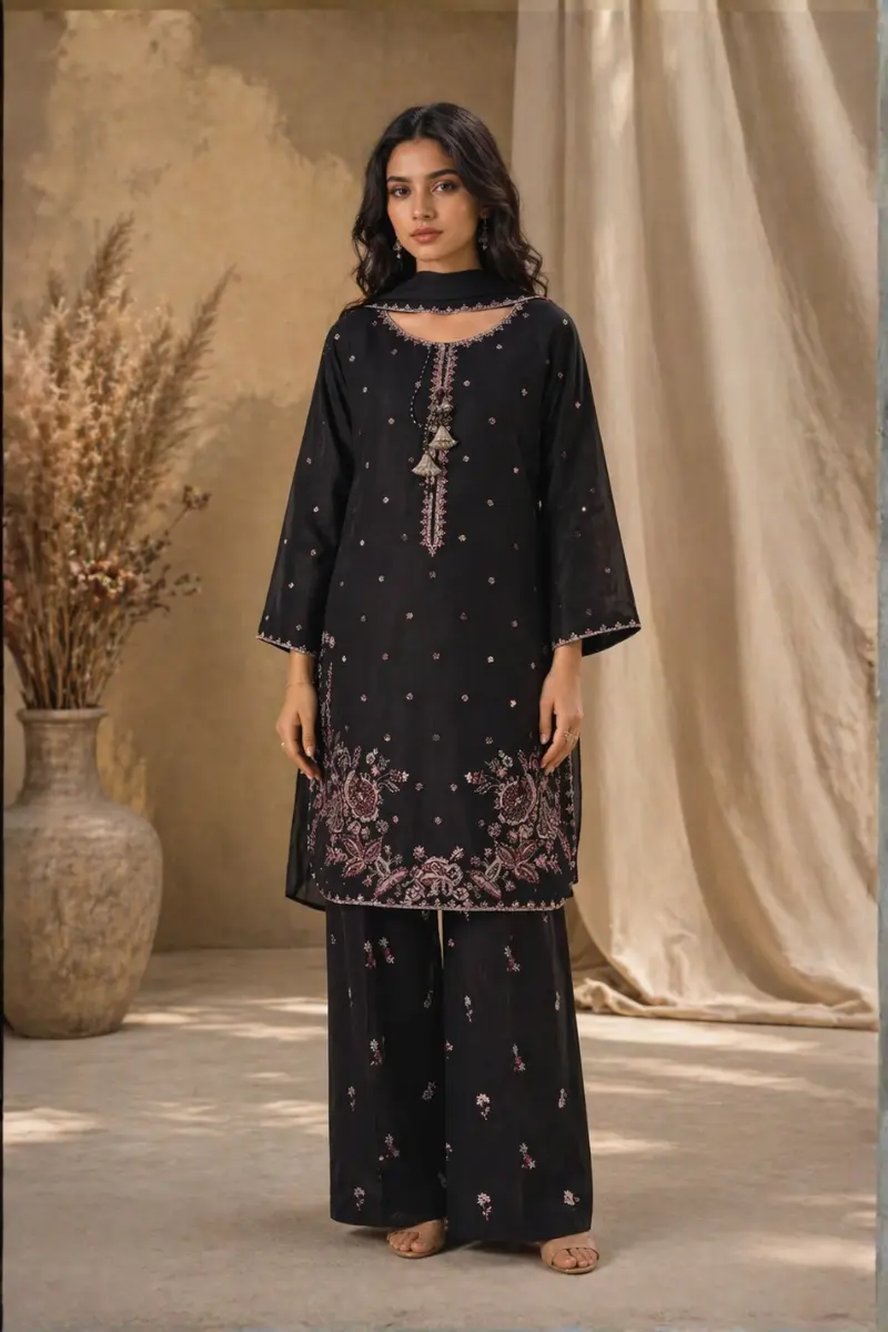 - Design Details: Black cotton shirt with subtle pink embroidery on the neckline and hem. Paired with a matching trouser for a refined and elegant look.