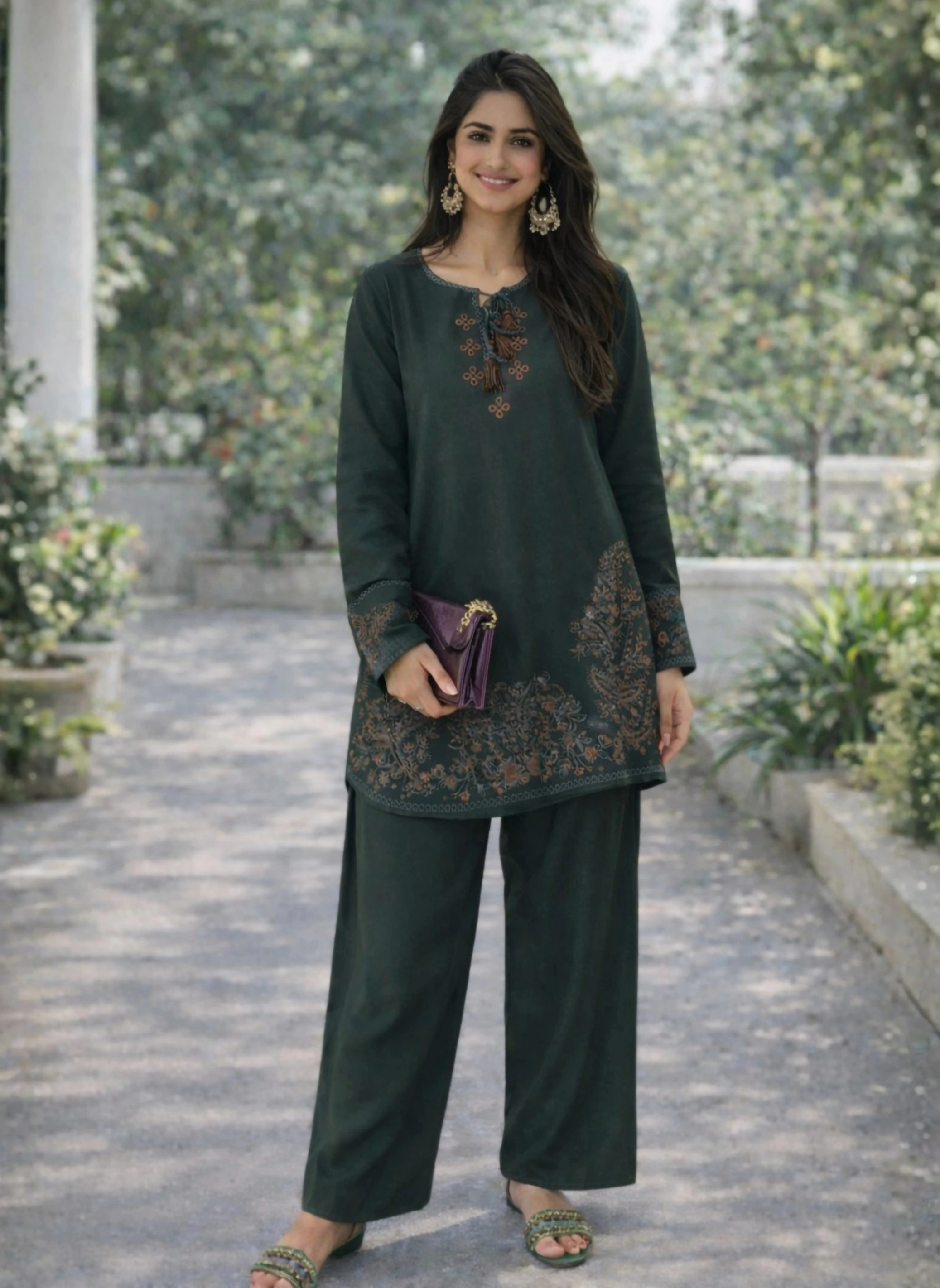 - Design Details: 2-Piece Cotton Suit Straight long shirt with wide leg trouser Elegant floral embroidery on daman (bottom border) Subtle embroidery on neckline Embroidered sleeve borders Soft, breathable premium cotton fabric Relaxed wide-leg trousers for comfortable fit