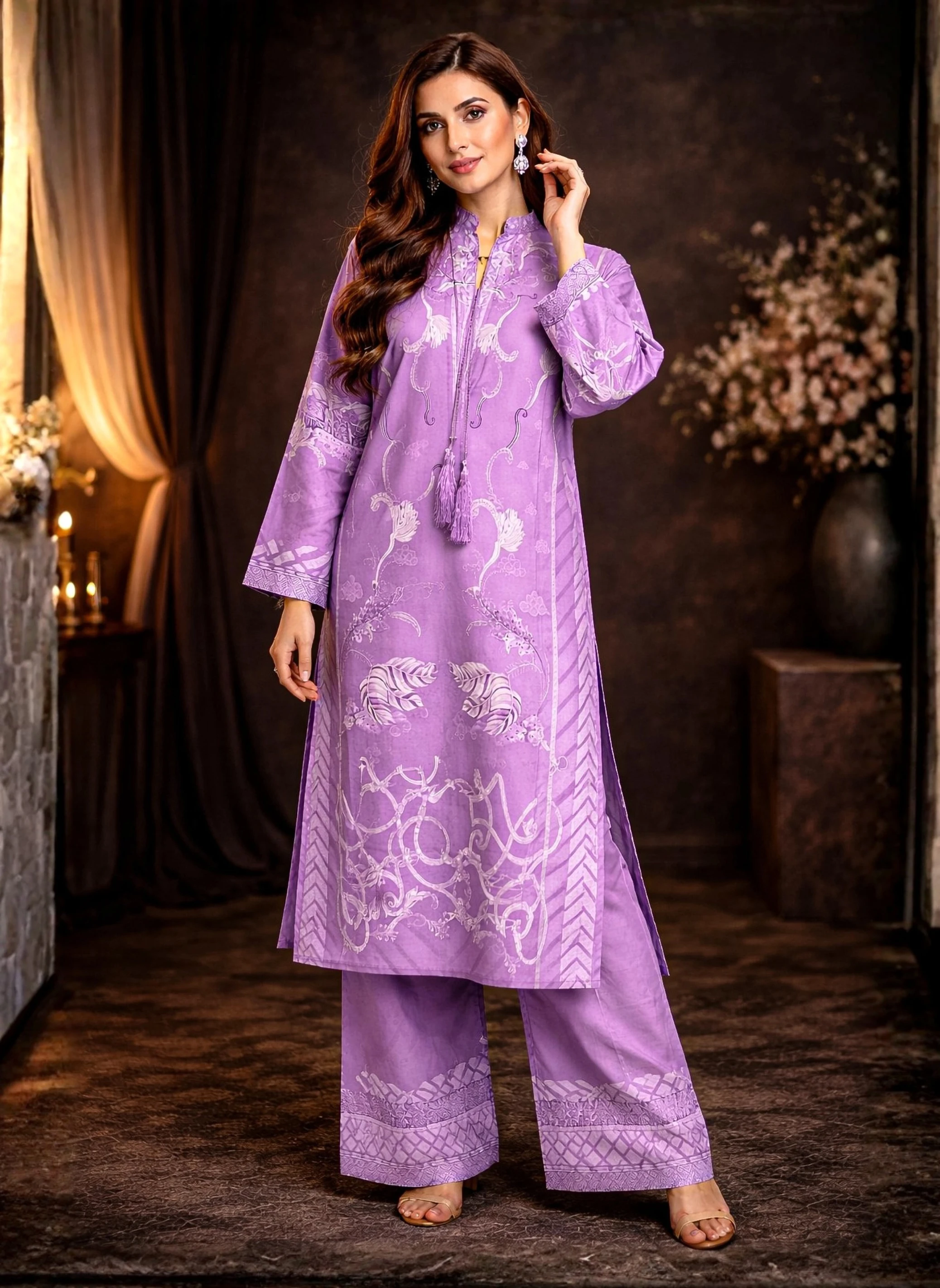 - Design Details: Stay chic in this premium Thai Silk 2-piece outfit. Featuring a sophisticated monochromatic print with tassel detailing on the neckline and stylish wide-leg trousers. Ideal for semi-formal gatherings and evening wear.