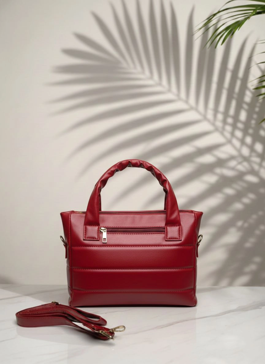 - Design Details: Trendy puffer padded design Soft premium leather-finish material Top handle for hand carry Detachable shoulder strap Zip closure for security Lightweight and comfortable to carry Spacious enough for mobile, wallet, makeup & essentials