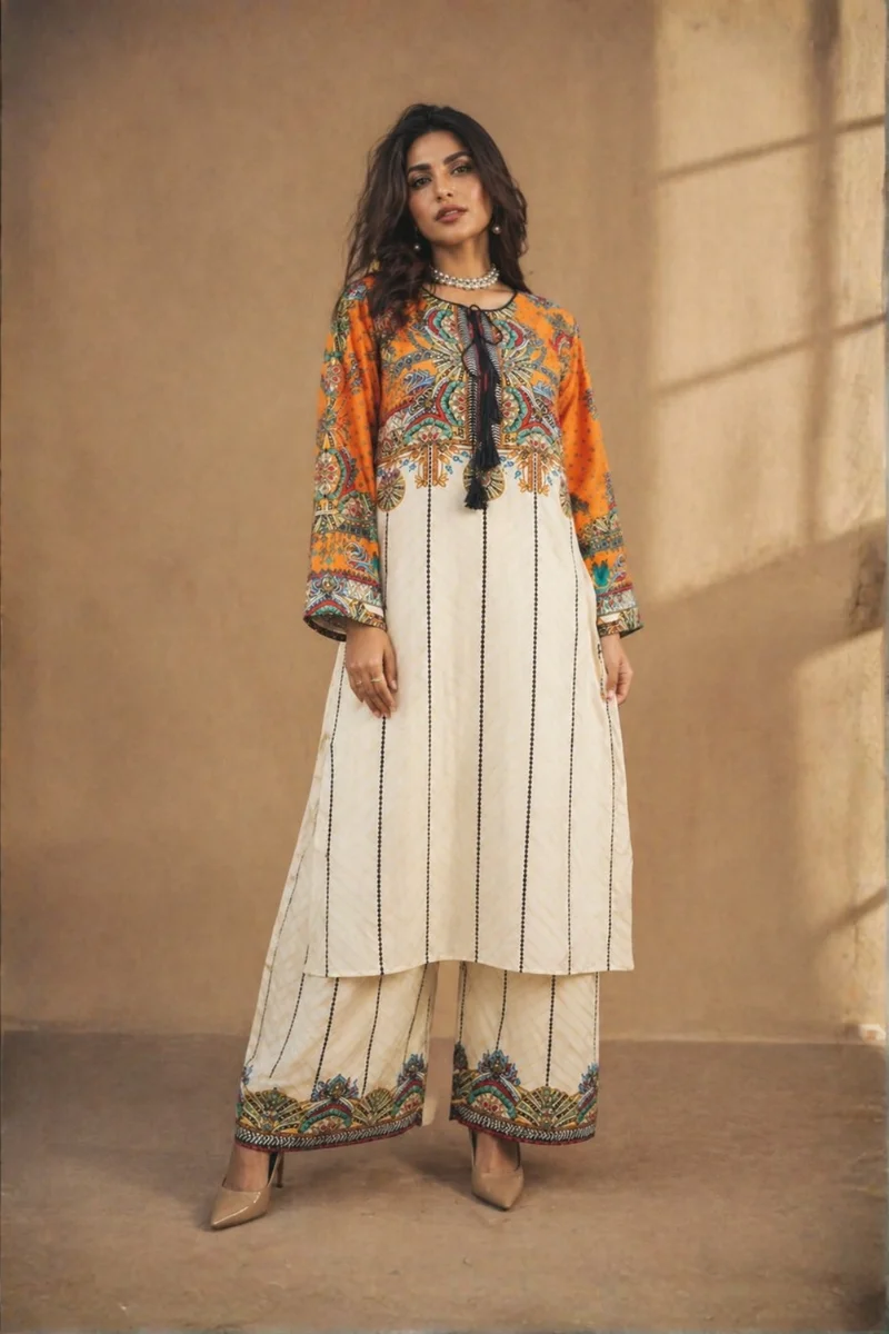- Design Details: This vibrant two-piece Grip Lawn set features a mustard orange bodice with intricate ethnic motifs and a flowing ivory base detailed with vertical pinstripes. The matte, wrinkle-free fabric is tailored into a tasseled shirt paired with wide-leg trousers for a sophisticated, effortless look.
