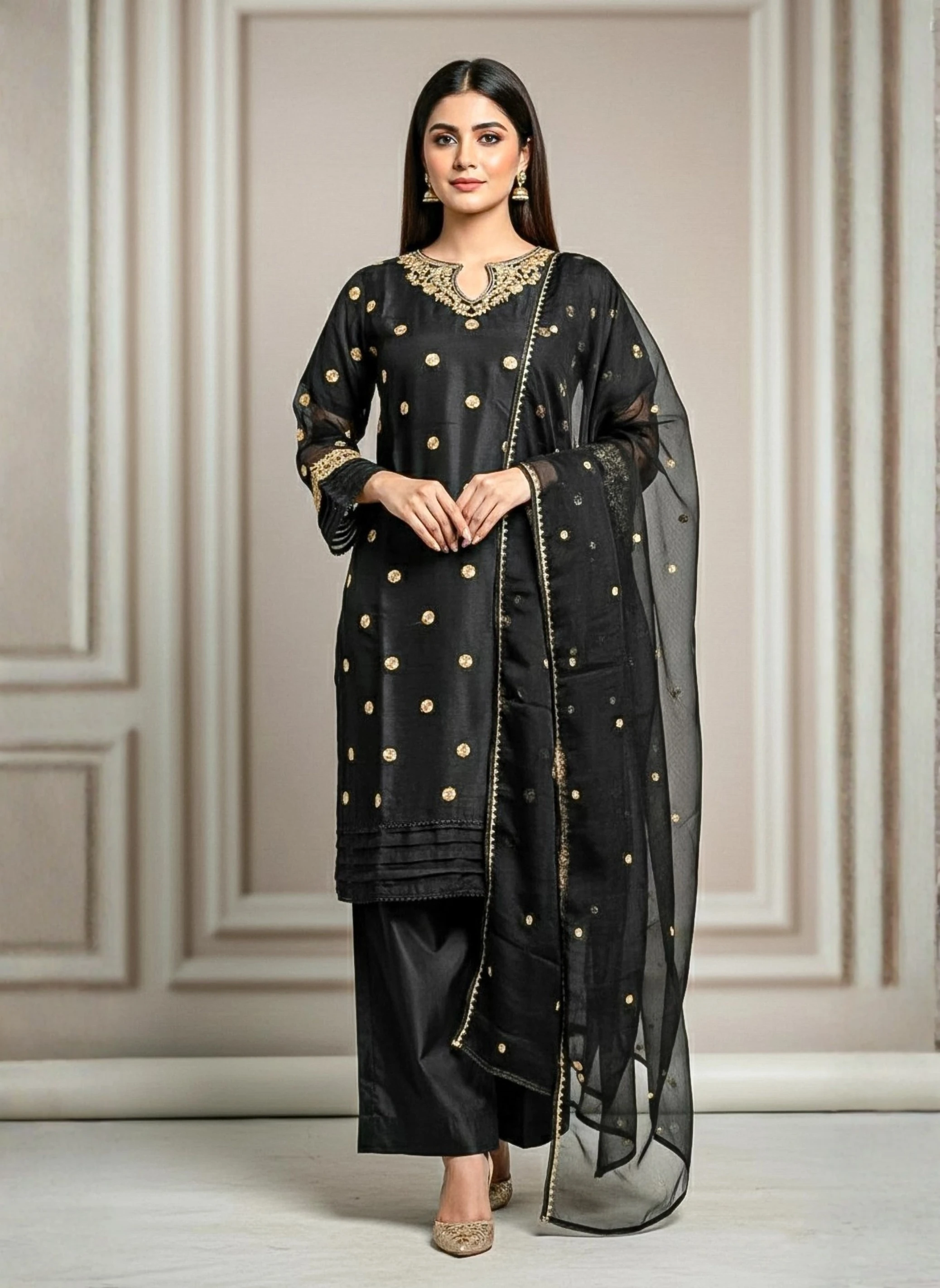 - Design Details: Shine this wedding season in our premium stitched 3-piece Chiffon suit. Featuring a heavy embroidered neckline with gold zari motifs, delicate lace-work on the shirt, and a fully embroidered dupatta. Paired with comfortable trousers for a timeless look.