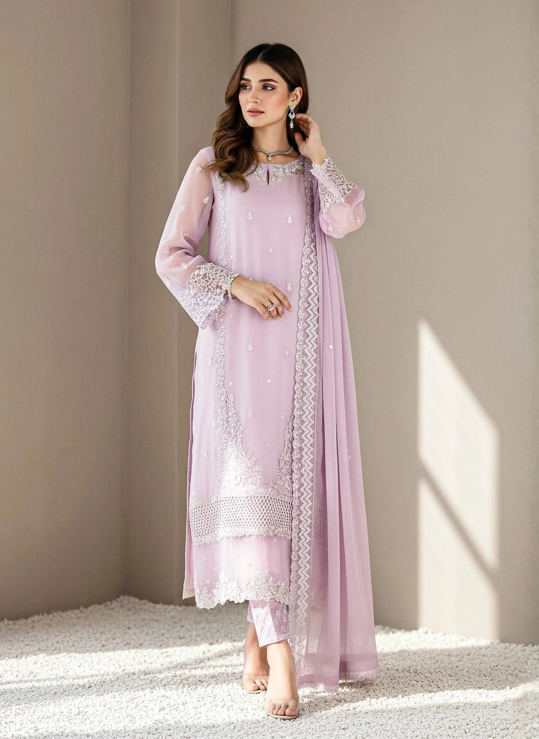 - Design Details: Sophisticated Mist 3-piece suit in Premium Chiffon. Features delicate embroidery and a matching Chiffon dupatta for ultimate summer comfort.