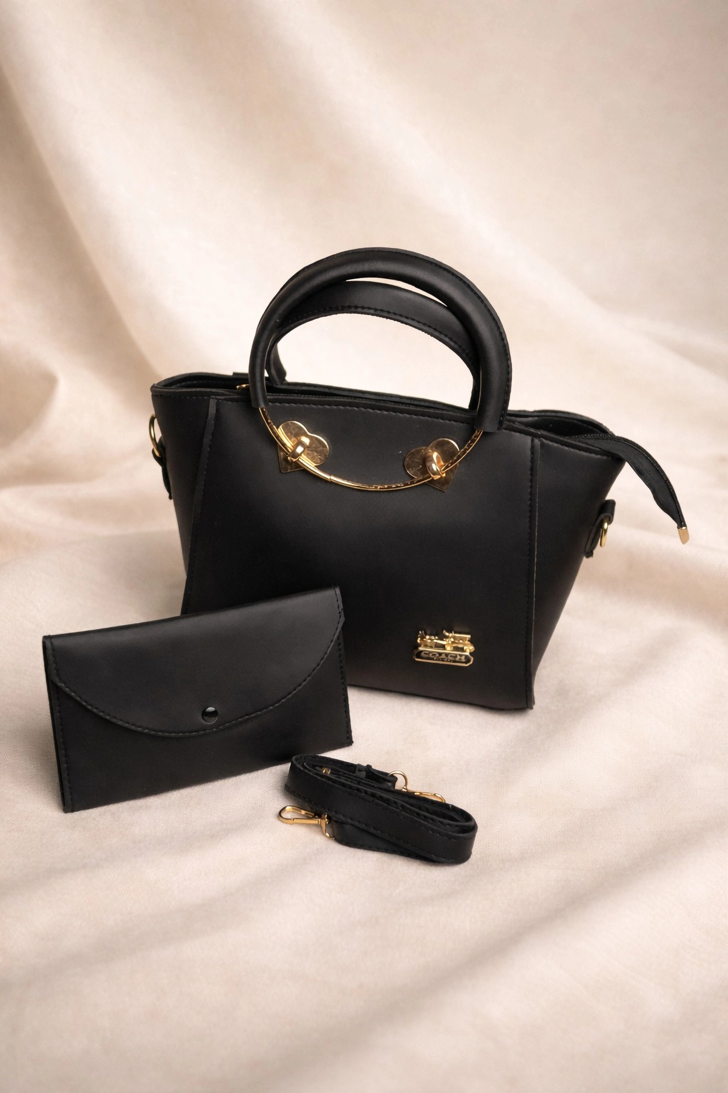 - Design Details: A stylish flared-edge tote featuring a unique gold-tone arched handle accent with heart-shaped connectors. It comes as a 2-piece set, including a matching slim envelope clutch/wallet.