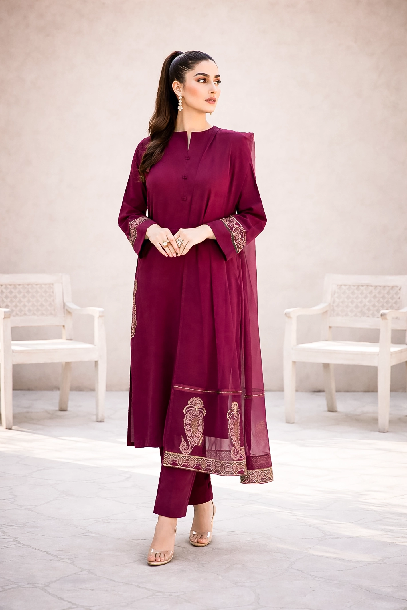 - Includes: Shirt, Trouser & Dupatta Long shirt with embroidery on both sides and pockets