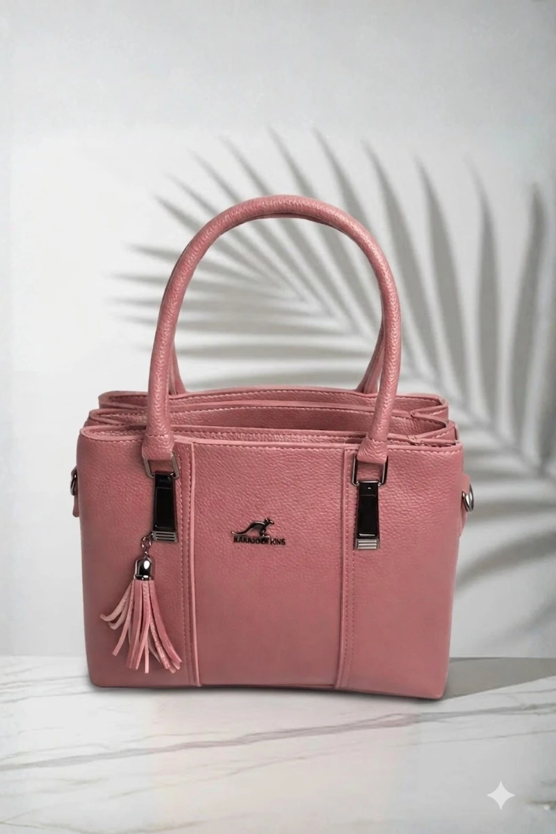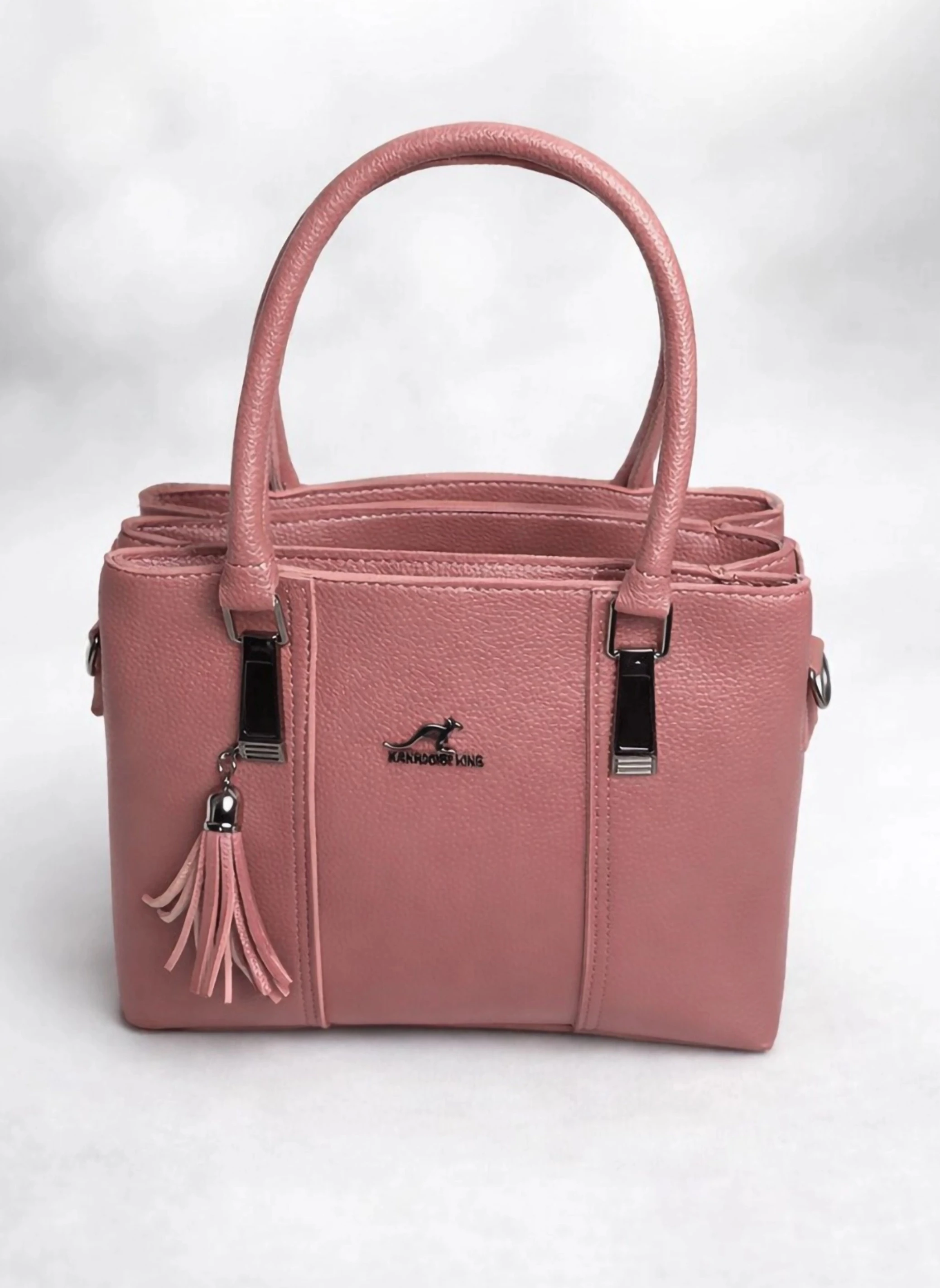 - Design Details: Color: Elegant Dusty Rose/Blush Pink. Hardware: Polished silver-tone metal accents and "Kangaroo" emblem. Key Features: Rolled top handles, a decorative matching leather tassel, and side rings for an optional shoulder strap.