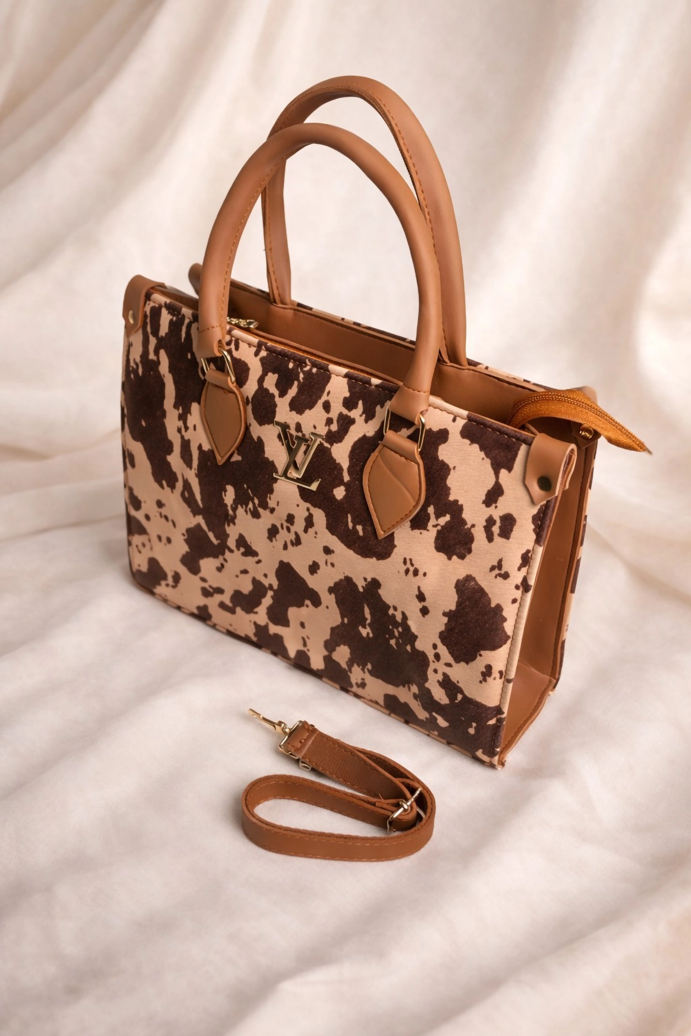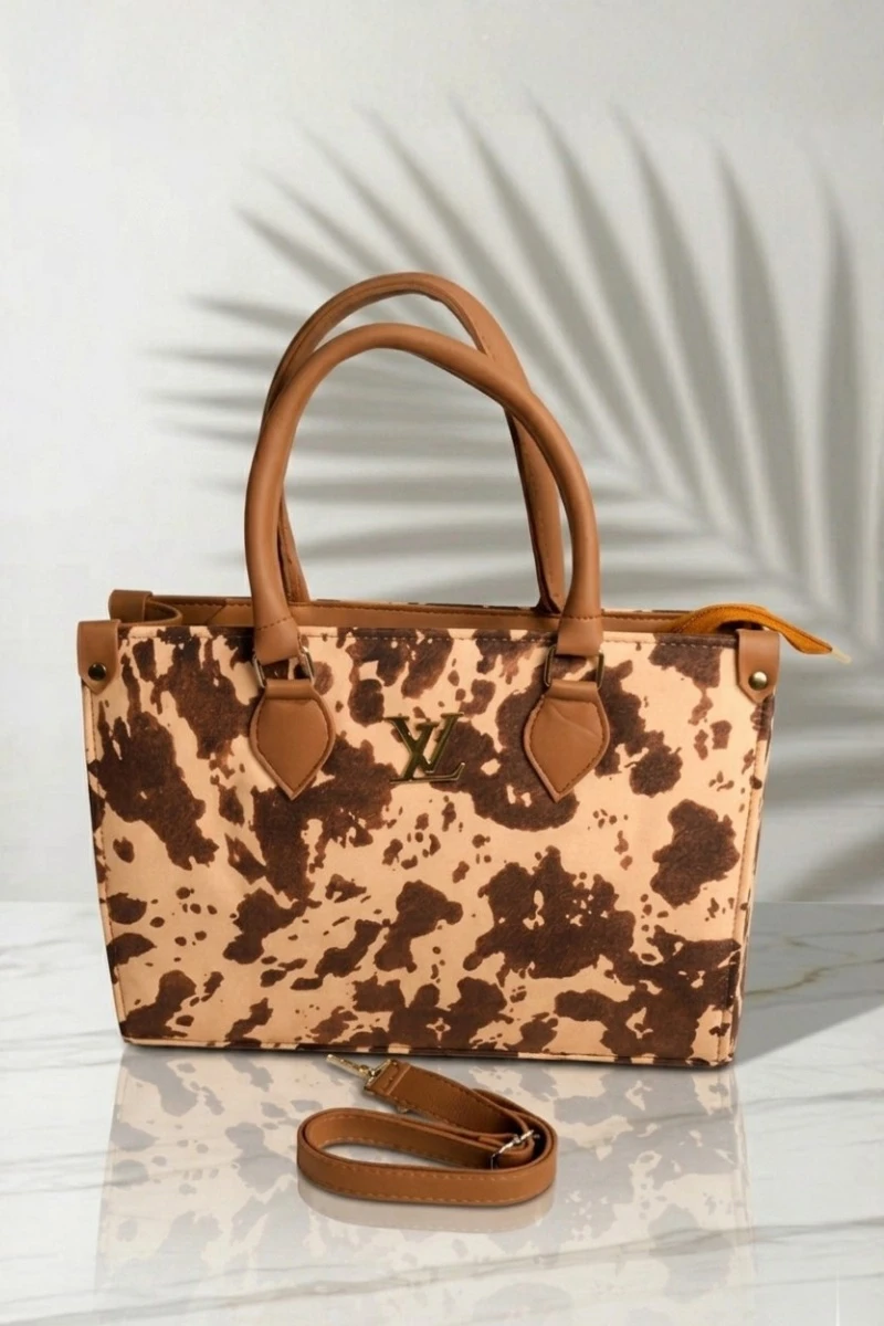 - Design Details: A structured rectangular tote featuring a prominent brown-and-cream animal print body. It has smooth tan-colored top handles, side panels, and leaf-shaped handle connectors.