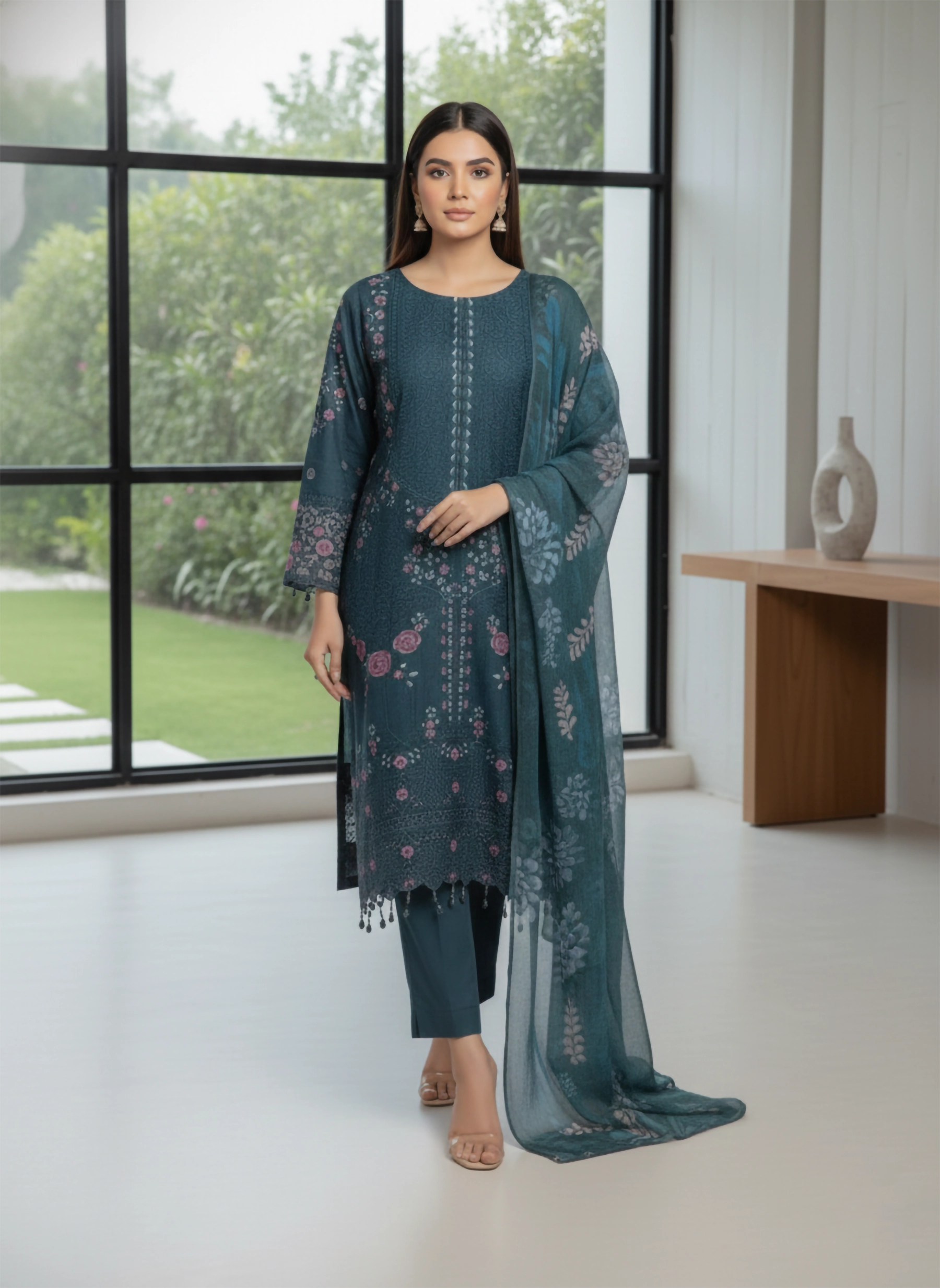 - Care Instructions: Washing: Hand wash recommended in cold water with a mild detergent. Do not bleach. Ironing: Iron on moderate heat. For the digital print dupatta, use a very low heat setting. Drying: Air dry in shade; direct sunlight may fade the deep teal color.