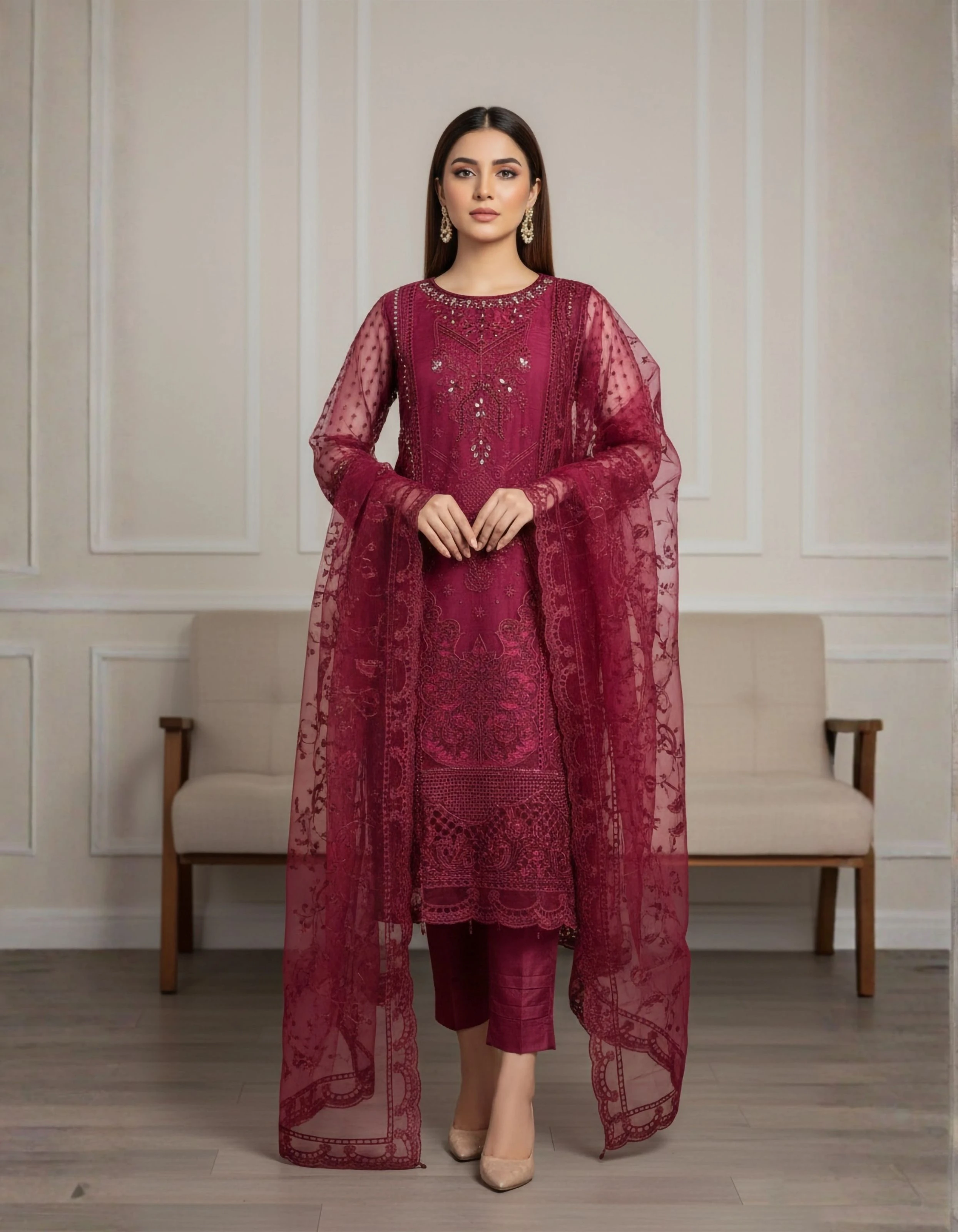 - Care Instructions: Dry Clean Only: Essential for preserving organza and hand-work. Iron on Reverse: Use a cool setting and iron on the back of the fabric. Safe Storage: Store in a fabric bag to protect the delicate embroidery from snags.