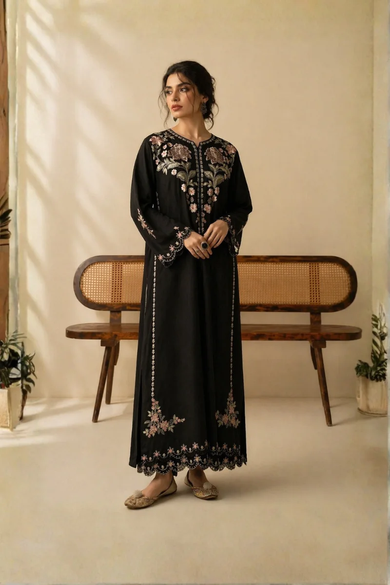 - Design Details: This Jet Black Stone Linen shirt features elegant rose floral embroidery and refined vertical paneling. The design is completed with sophisticated scalloped lace cuffs and an intricate cutwork hemline for a timeless look.